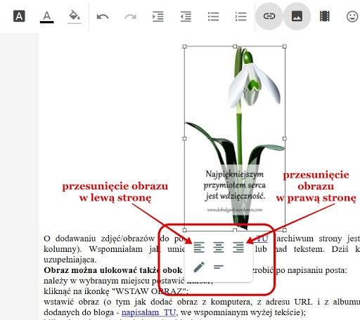Jeśli chcesz urozmaicić wygląd wpisu, a zarazem przyporządkować obraz do określonego fragmentu tekstu o wiele ciekawszym sposobem będzie dodanie obrazu obok . Ustaw float w css dla obrazka.